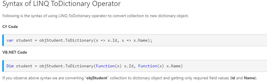 In LINQ, ToDictionary operator is used to convert list/collection (IEnumerable<T>) items to a new dictionary object (Dictionary<TKey,TValue>) and it will optimize list/collection items by getting only required values. Syntax of LINQ ToDictionary Operator F