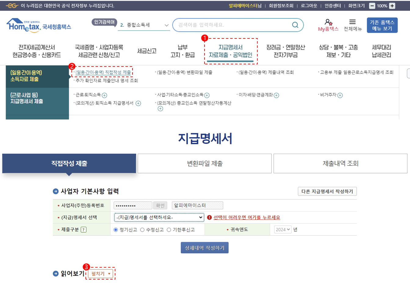 1인 개인사업자 - 신규사업자 소득자료 매월(반기) 제출 안내 처리 방법 본문